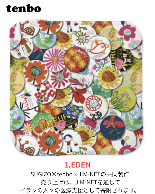 tenboの寄付商品、 EDEN、ブーゲンビリアが とっても可愛くミニハンカチタオルになって登場です。 毎日、何気なく使うハンドタオル。 だからこそtenboは、「温もりあふれるある一枚」をつくりました。 サイズ感は20cm×20cmです。 バッグの中でもかさばらず、 外出先や仕事の合間、ふとした瞬間に手に取れるサイズ感で とても使いやすいサイズ感となっております。 tenboのミニハンカチタオルを使うたび、 少し心がゆるんだり、ほっとしたり、 「大丈夫」と自分に声をかけられるような、 そんな存在になれたらと願っています。 ファッションを通して あなたの日常に寄り添います。 ・サイズ 20cm×20cm ・綿100% 1、EDEN イラクの小児がんの子どもたちが書いた絵をアートパレットにしました。 SUGIZO×tenbo×JIM-NETの共同製作になります。 EDEN関連商品の売り上げは、JIM-NETを通じてイラクの人々の医療支援として寄附されます。 Chocolate can Design:Maki SATO 2、ブーゲンビリア ブーゲンビリア 〜魂の花とコーラルボイス〜 2023年 沖縄慰霊の日に沖縄で開催したファッションショーでSUGIZOさんが着用したメンズドレスを商品化しシュシュに込めました。 非売品のコンセプトカード付きです 【込められた想い】 沖縄に咲き誇る花ブーゲンビリア。 『魂の花』とも呼ばれ誰もがその色鮮やかさに魅了されます。 実際には花の色ではなく葉の色。 本当の花は小さく中央に儚く咲く白い花。 花の魂の色は変わる事なく純真無垢な色で世情を強く優しく見守ります。 沖縄の歴史的戦禍と向き合い平和を願い、環境問題に起因され虐げられる自然を守りたい。 ポケットには生命力溢れ情熱的な珊瑚。 伝わってくるその声は、本来の姿でありたいという声。 本来あるべきその姿から見えるもの。 世界・環境・地球が目まぐるしく変わっていこうともブーゲンビリアの花のように変わらぬ白い魂で願わずにはいられない。 沖縄こそ縮図であるという事。 沖縄の平和への願いをこめたデザインです 『商品の売上の一部を平和活動へ寄付させていただくことで、沖縄の八重山の海にサンゴ畑が誕生します。NPO法人アクアプラネット様を通じて、沖縄の八重山の海にサンゴの畑ができます。 永続的な活動のため tenboの専用のサンゴ畑には平和を願うサンゴが増えていきます。』