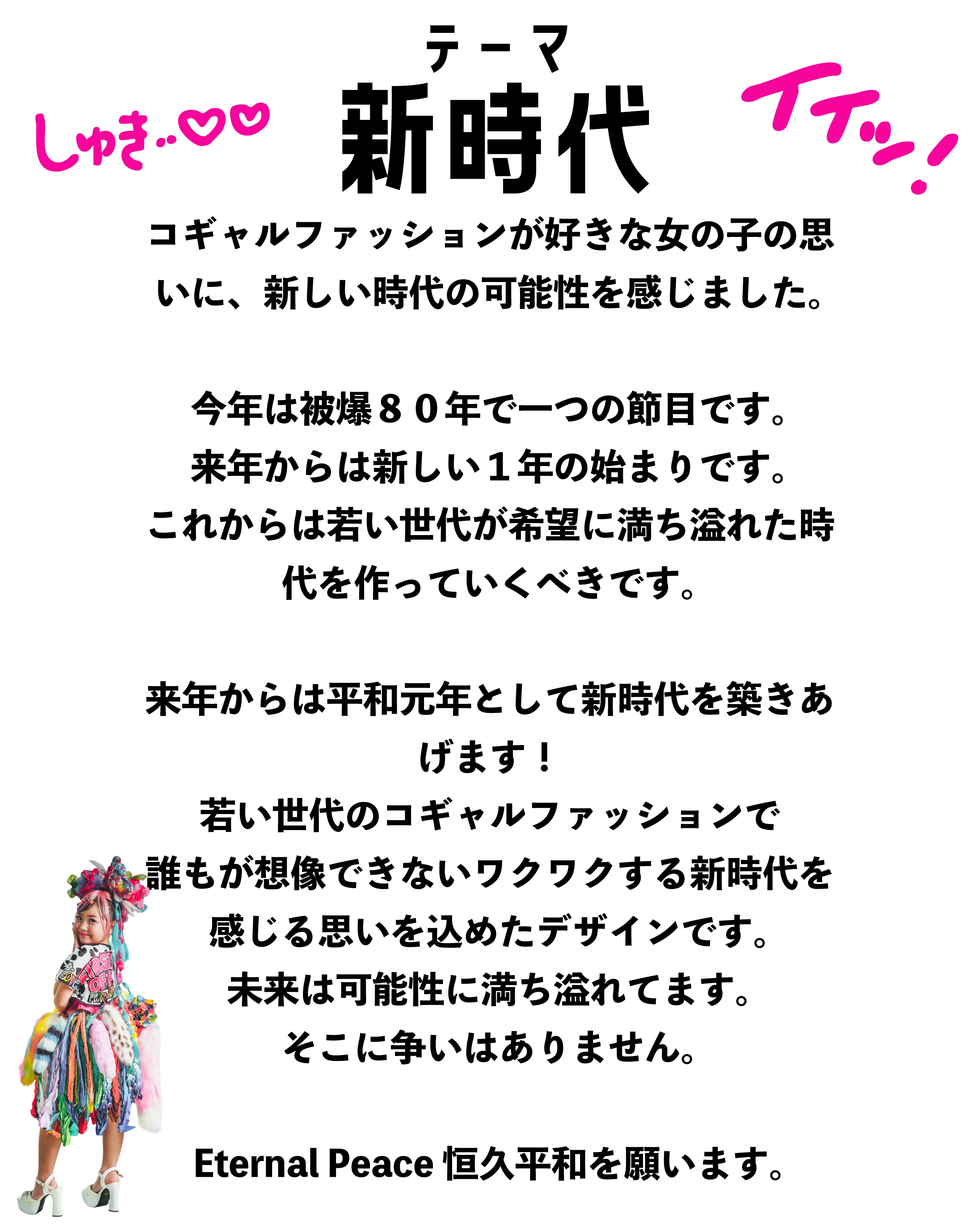 若い世代のコギャルファッションで、誰もが想像できないワクワクする新時代を感じる思いを込めたデザインです。
