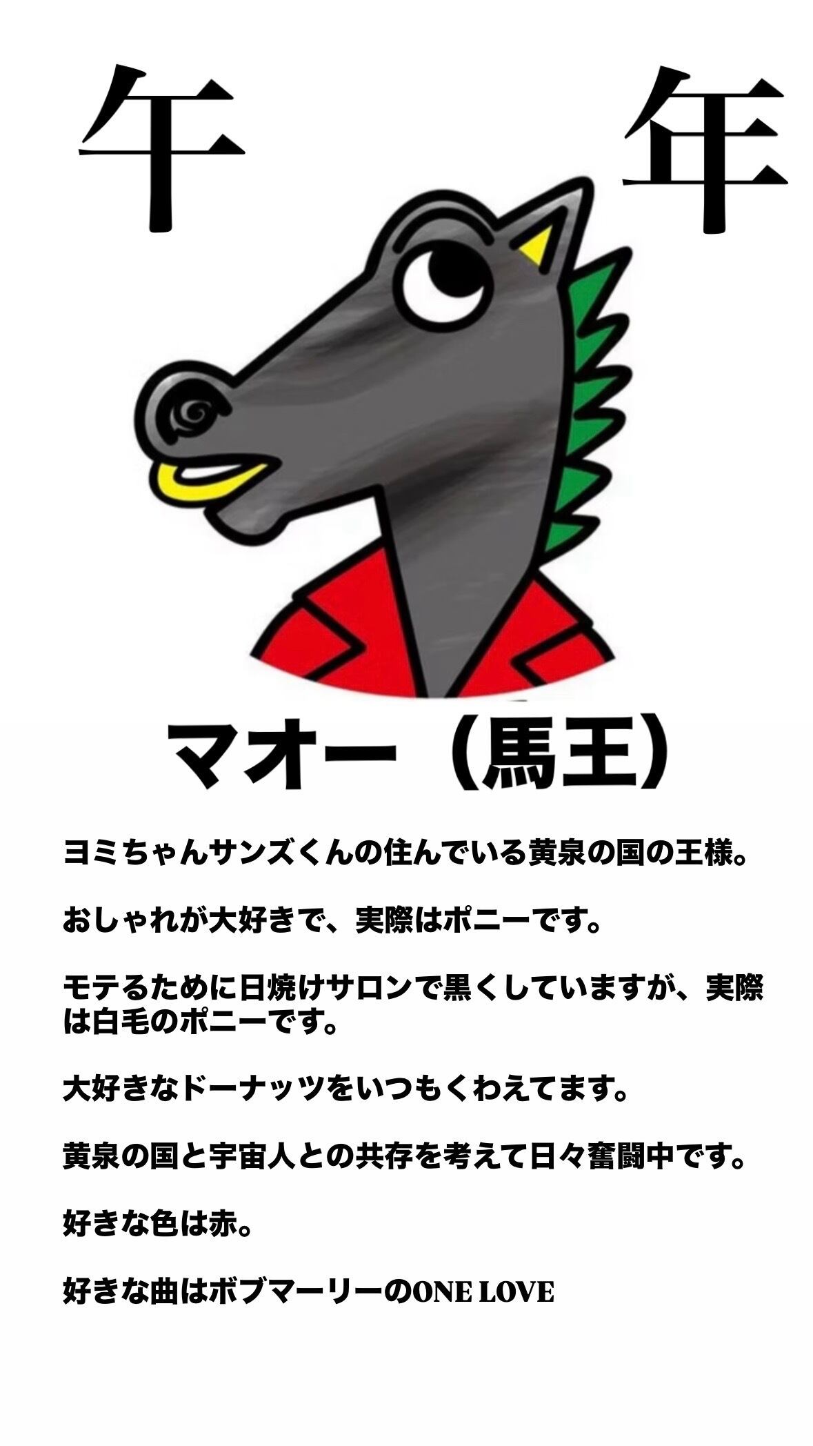 ヨミちゃんサンズくんの住んでいる黄泉の国の王様。おしゃれが大好きで、実際はポニーです。モテるために日焼けサロンで黒くしていますが、実際は白毛のポニーです。