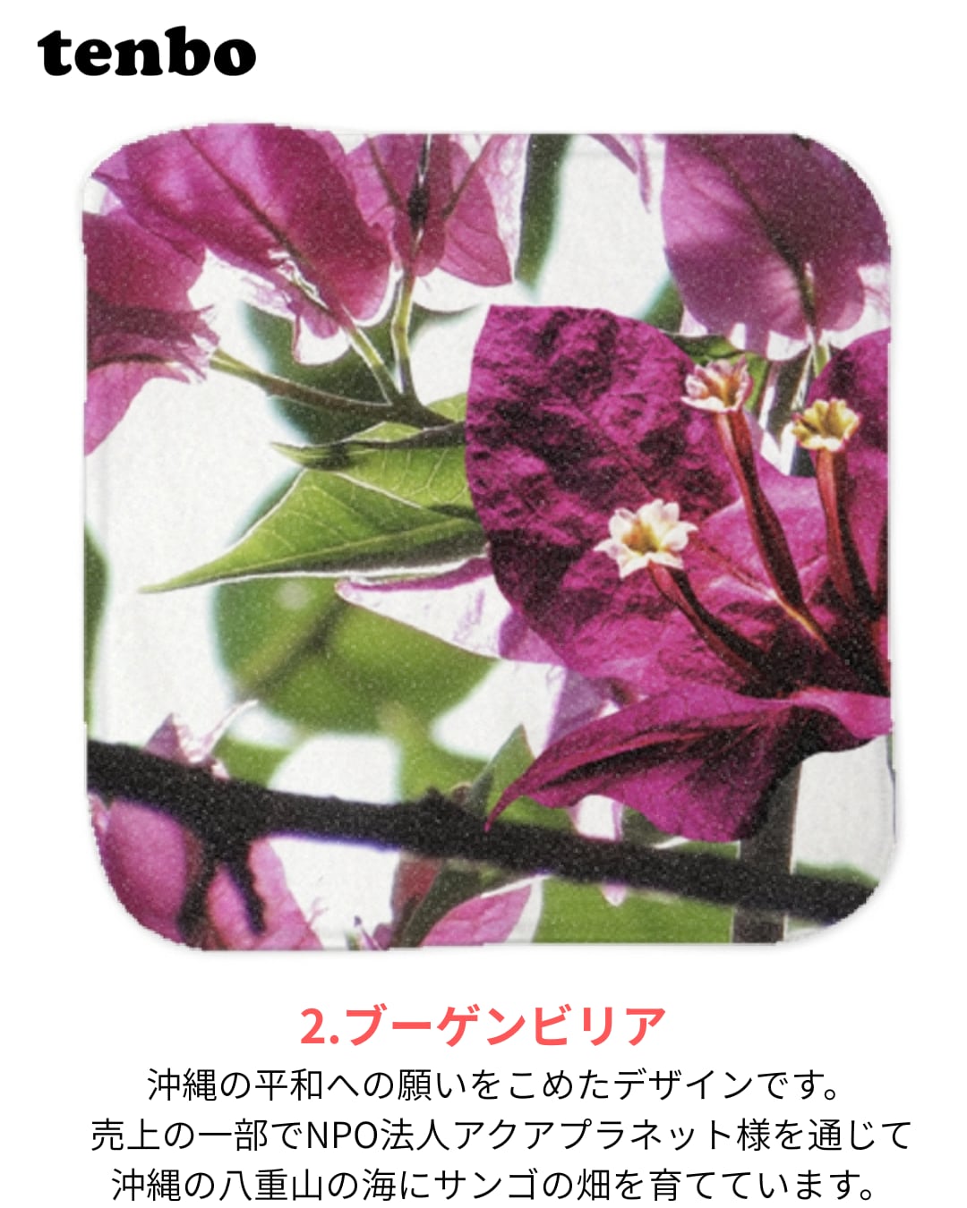 『商品の売上の一部を平和活動へ寄付させていただくことで、沖縄の八重山の海にサンゴ畑が誕生します。NPO法人アクアプラネット様を通じて、沖縄の八重山の海にサンゴの畑ができます。