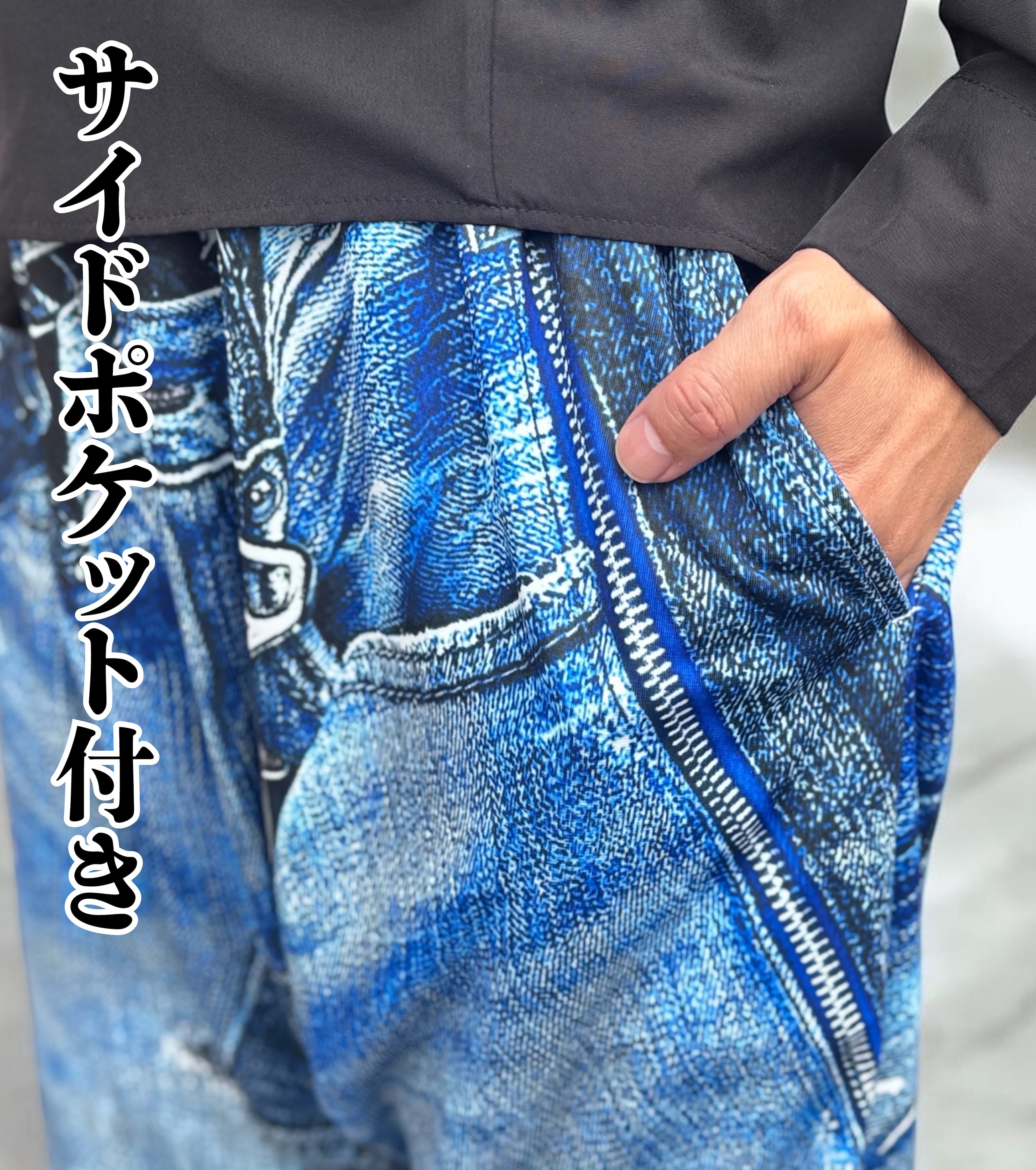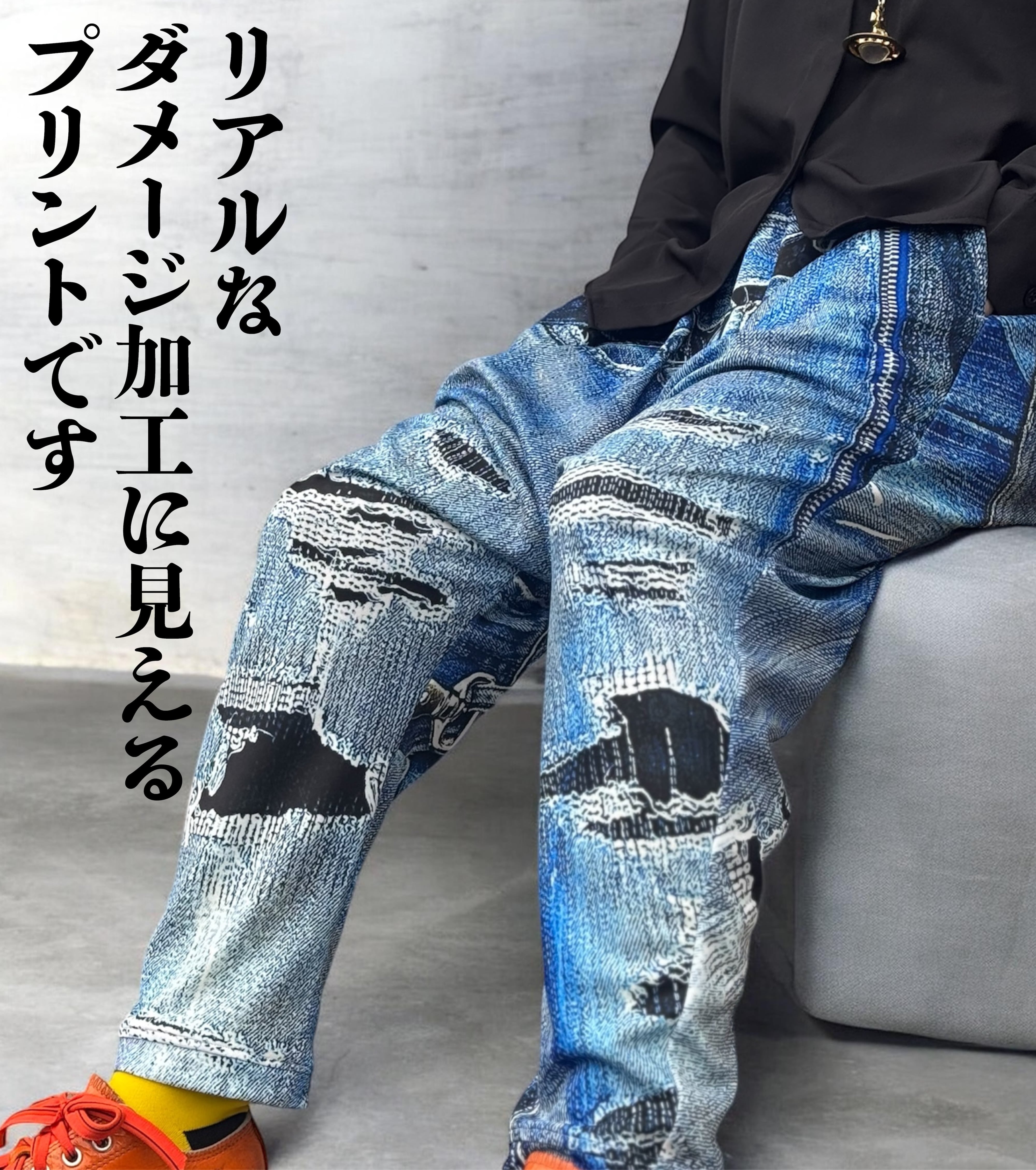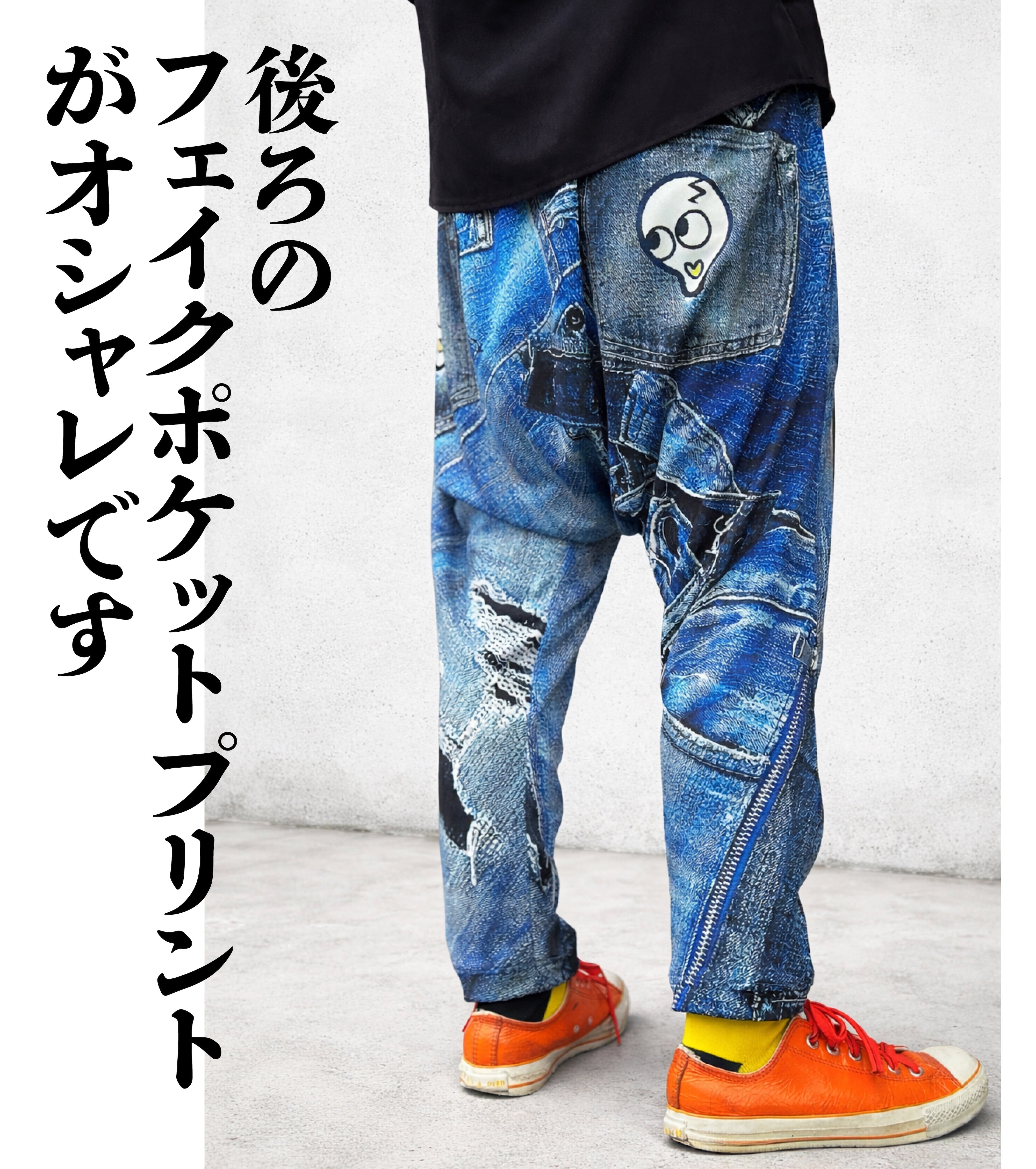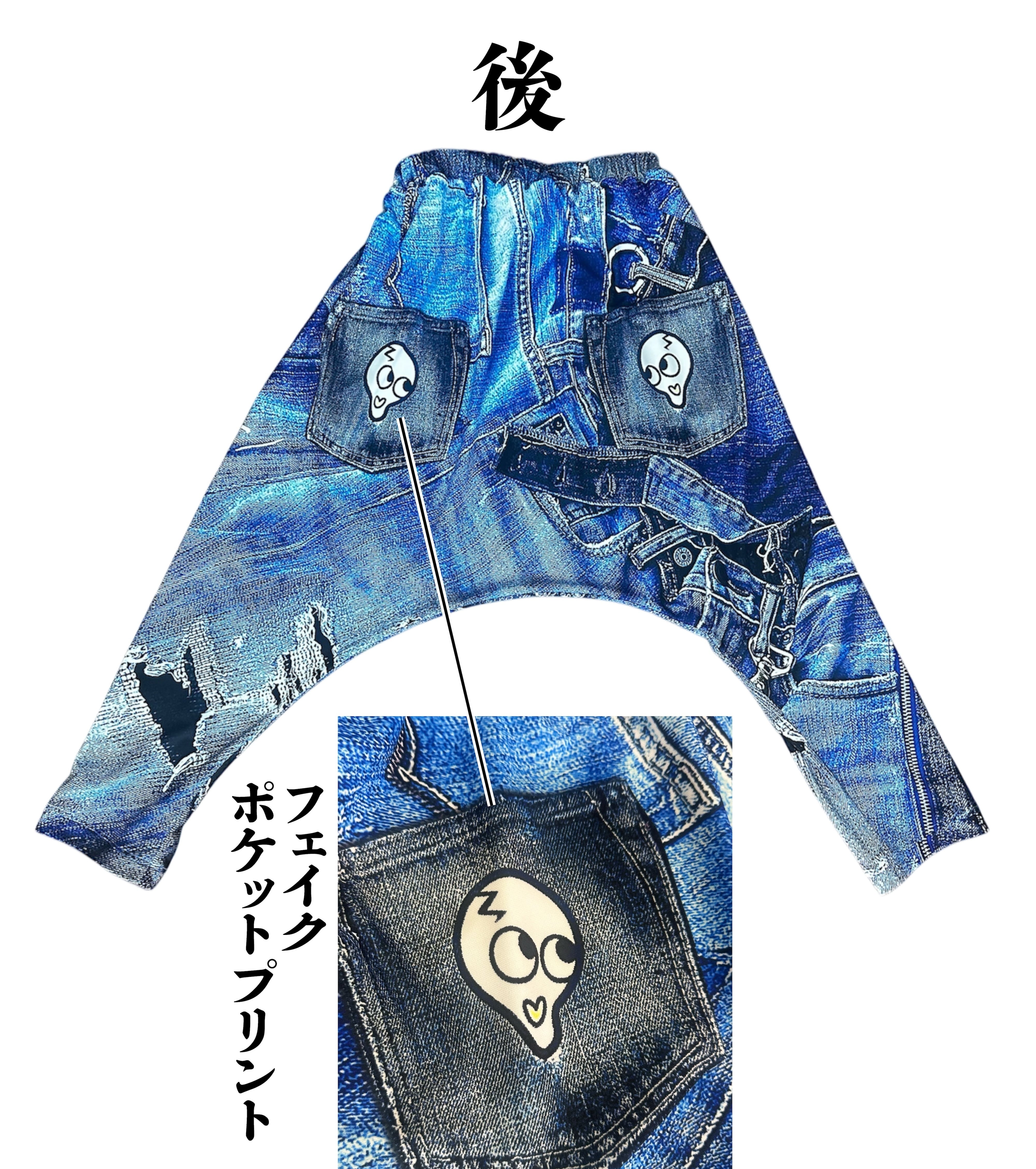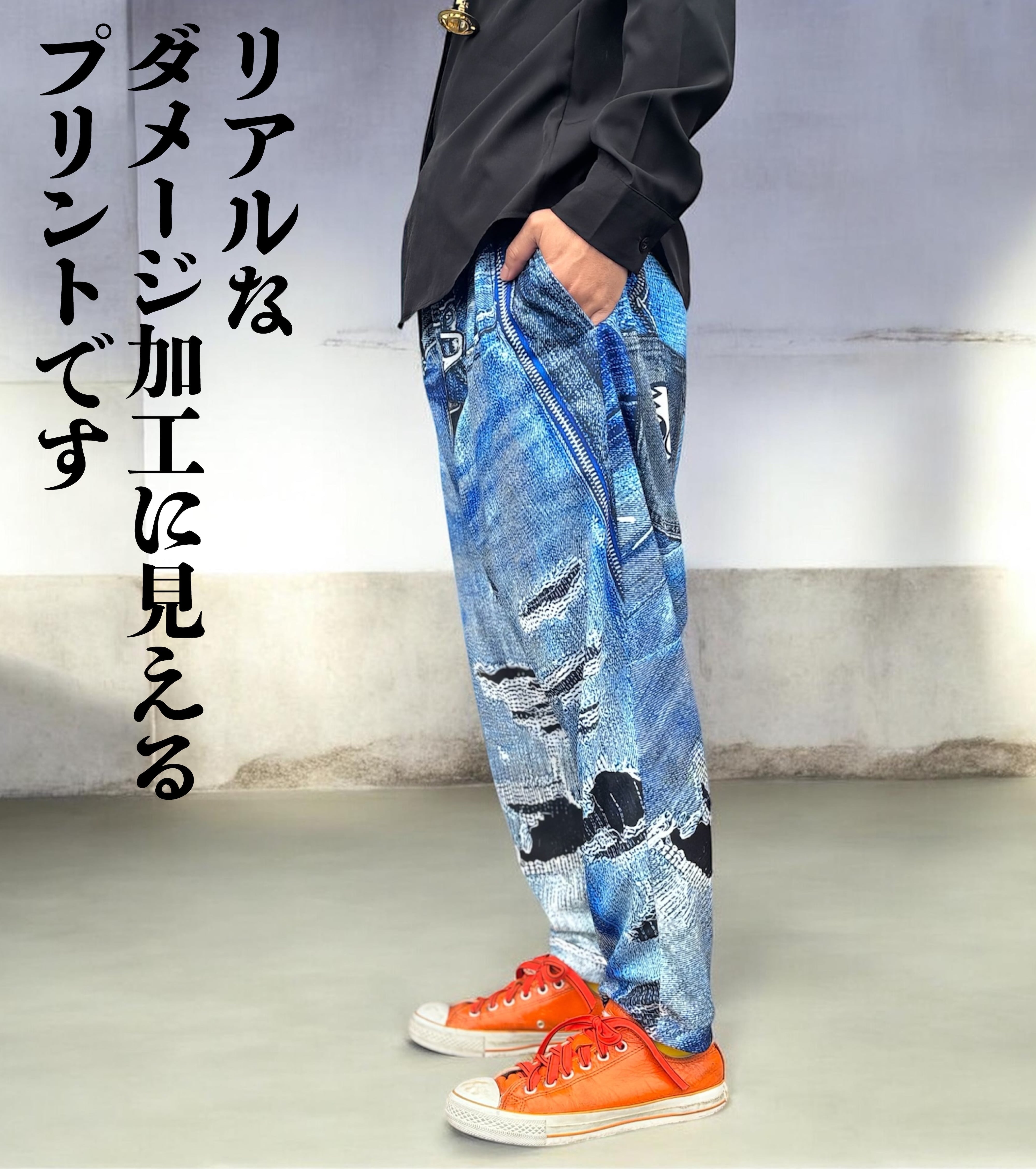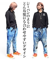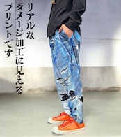 リアルな立体デニムがプリントされたサルエルパンツです。本物のダメージ加工に見えるような高画質プリントがオシャレを演出します