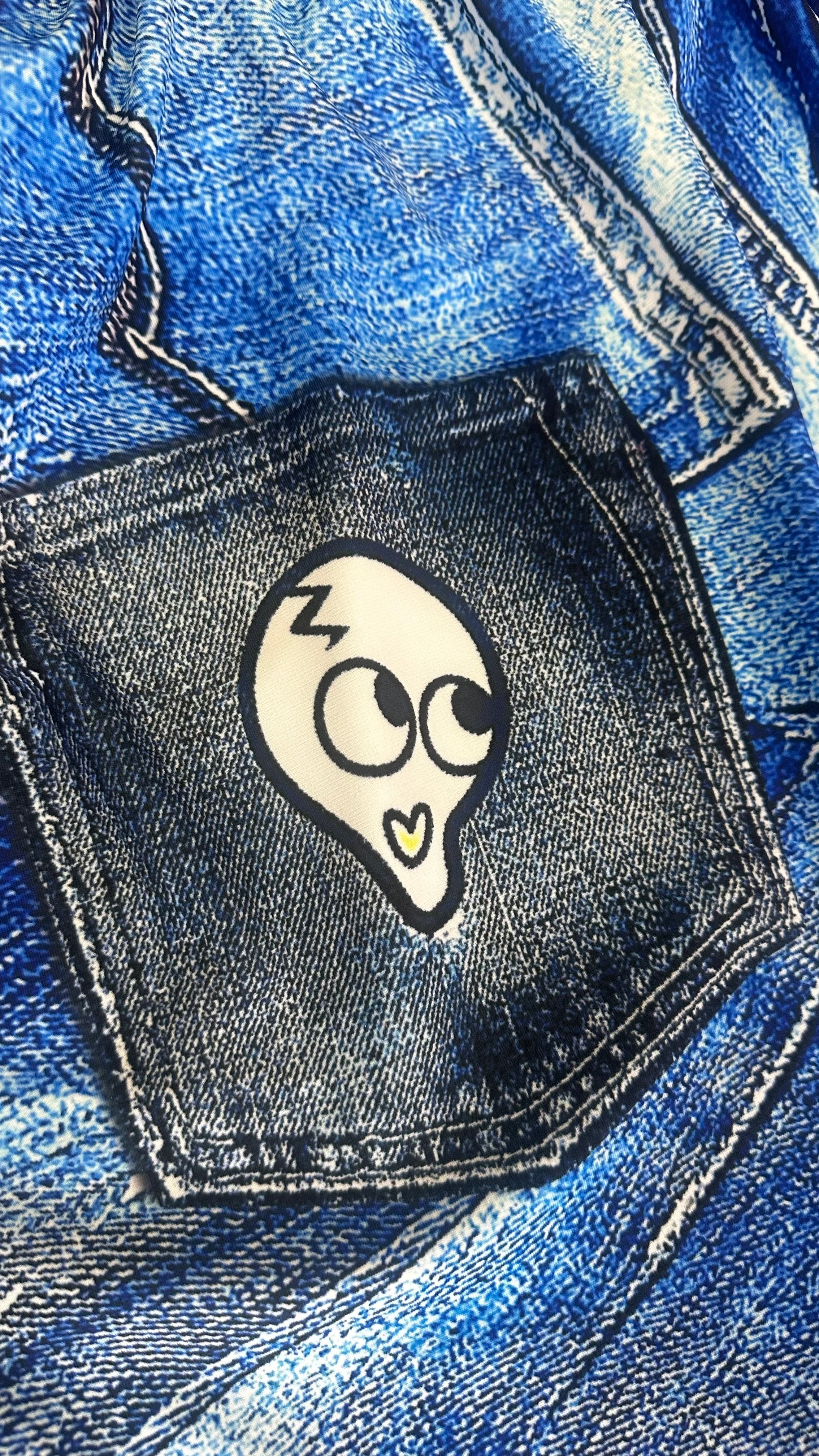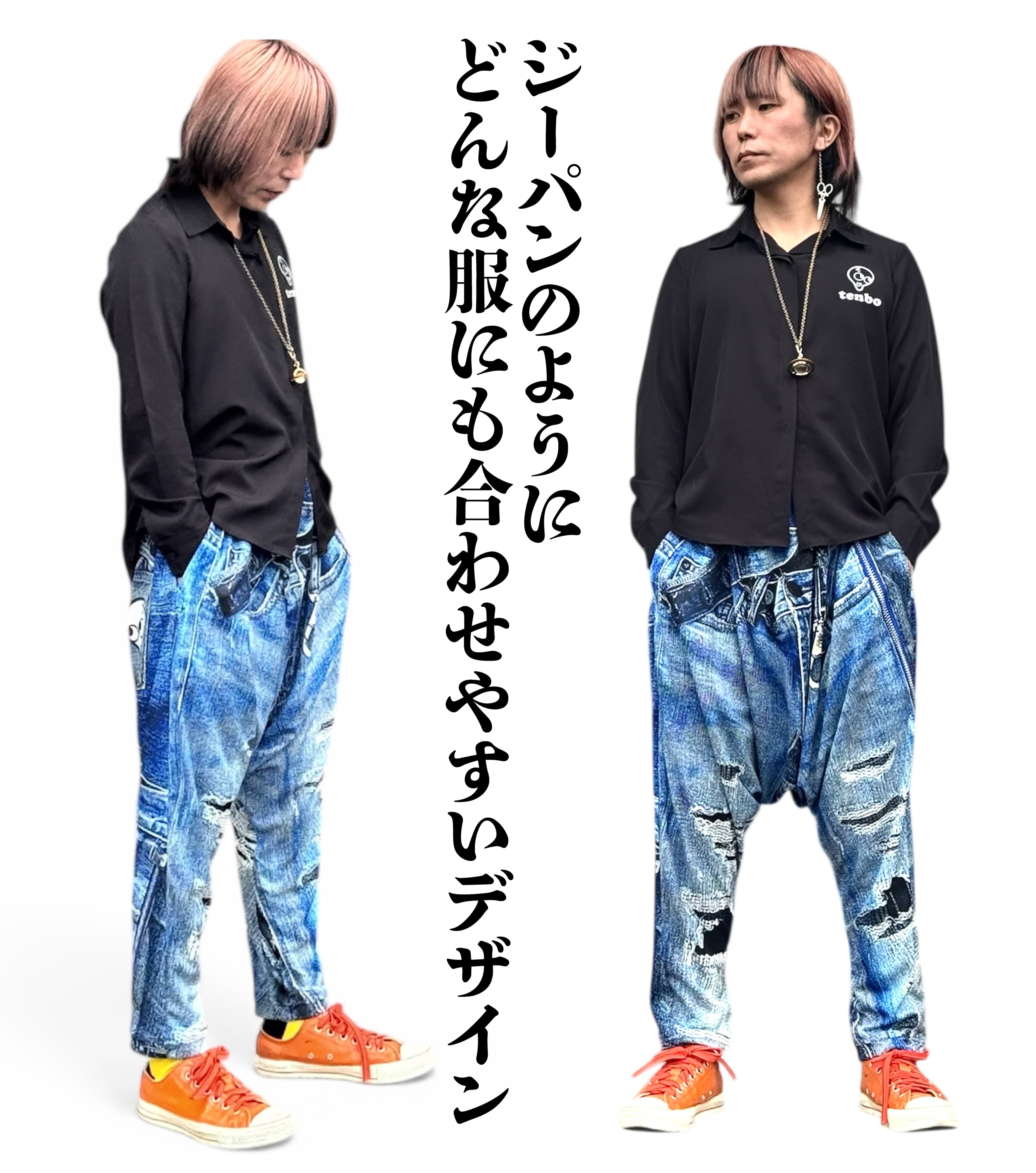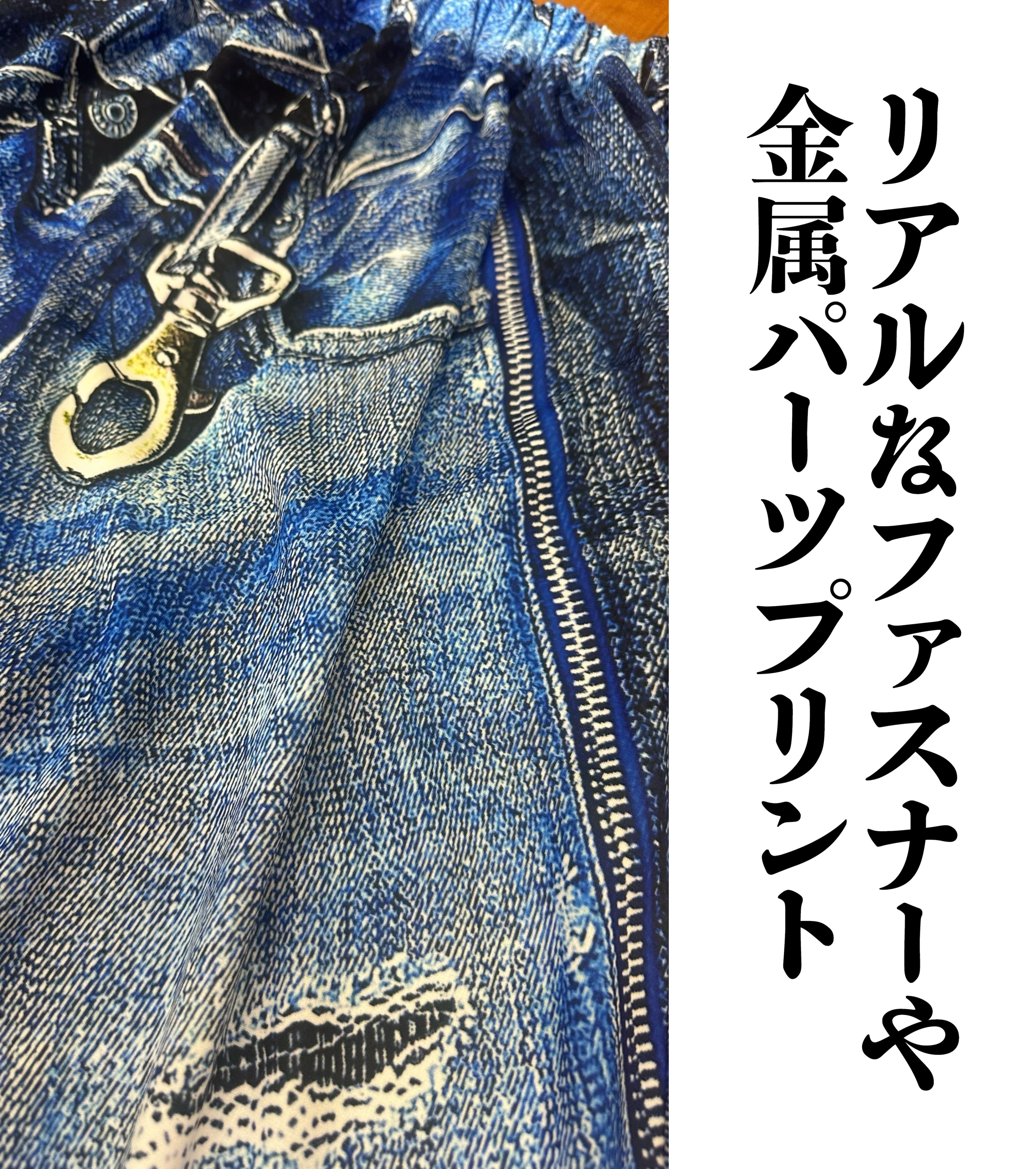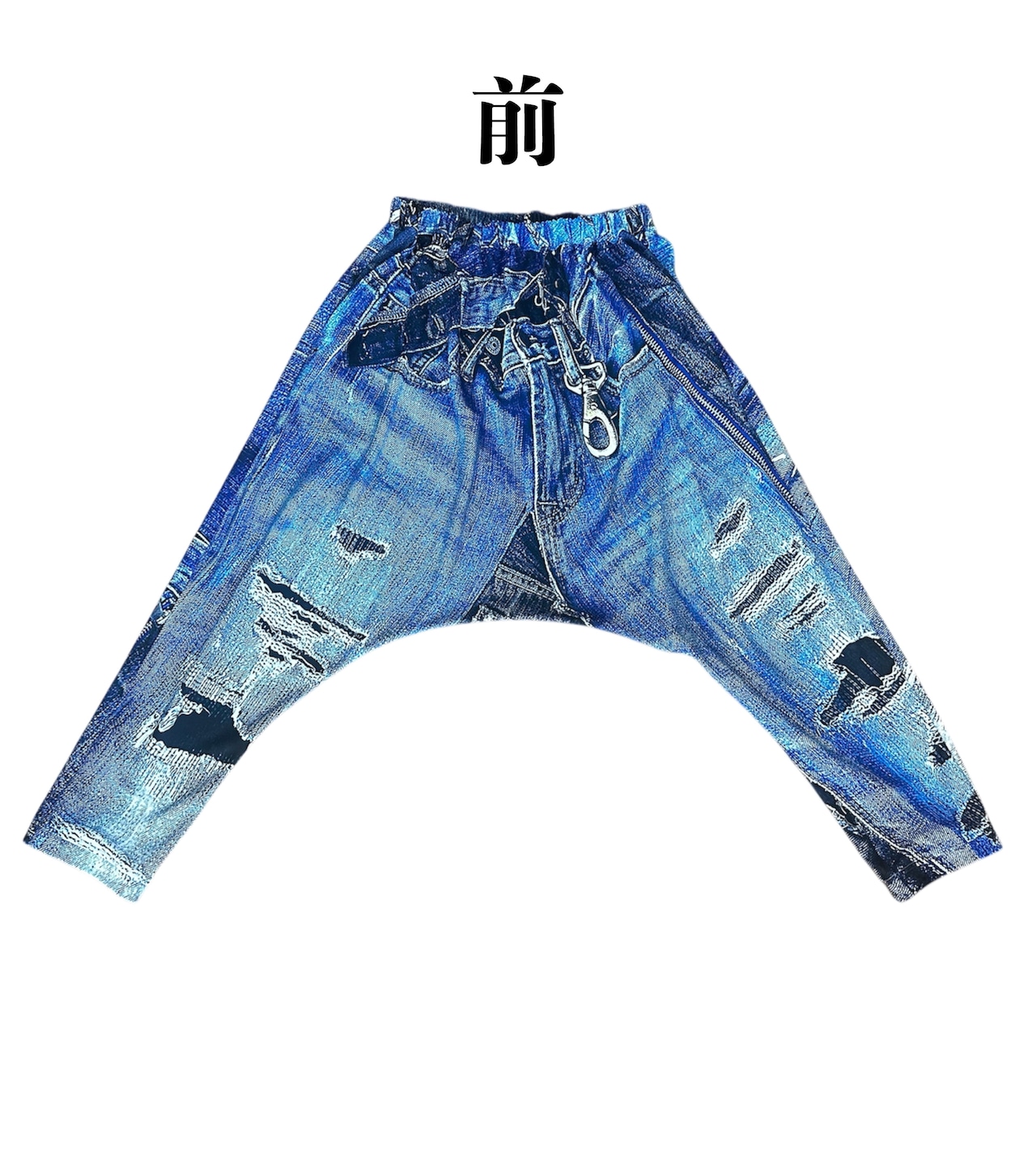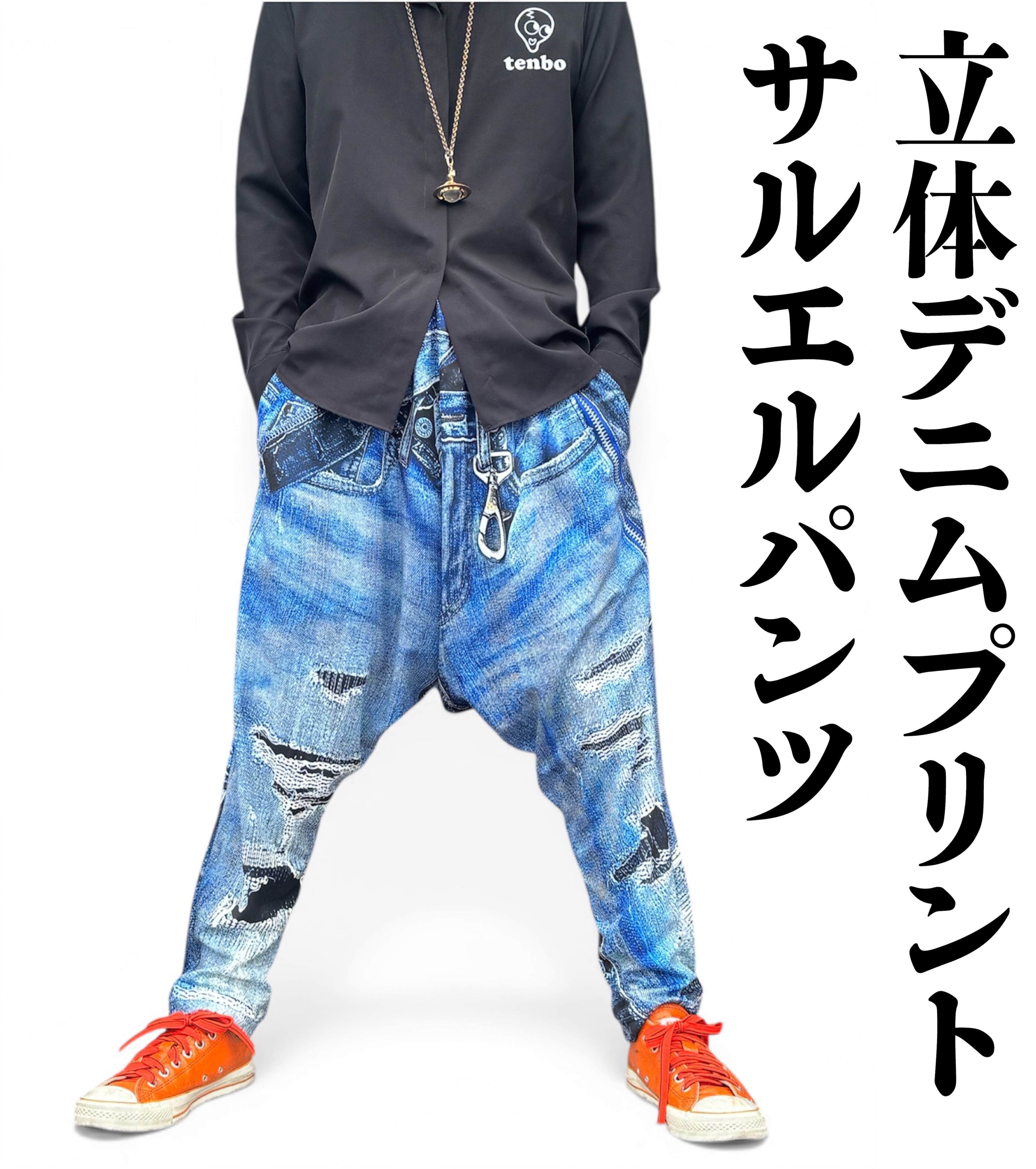 リアルな立体デニムがプリントされたサルエルパンツです。本物のダメージ加工に見えるような高画質プリントがオシャレを演出します