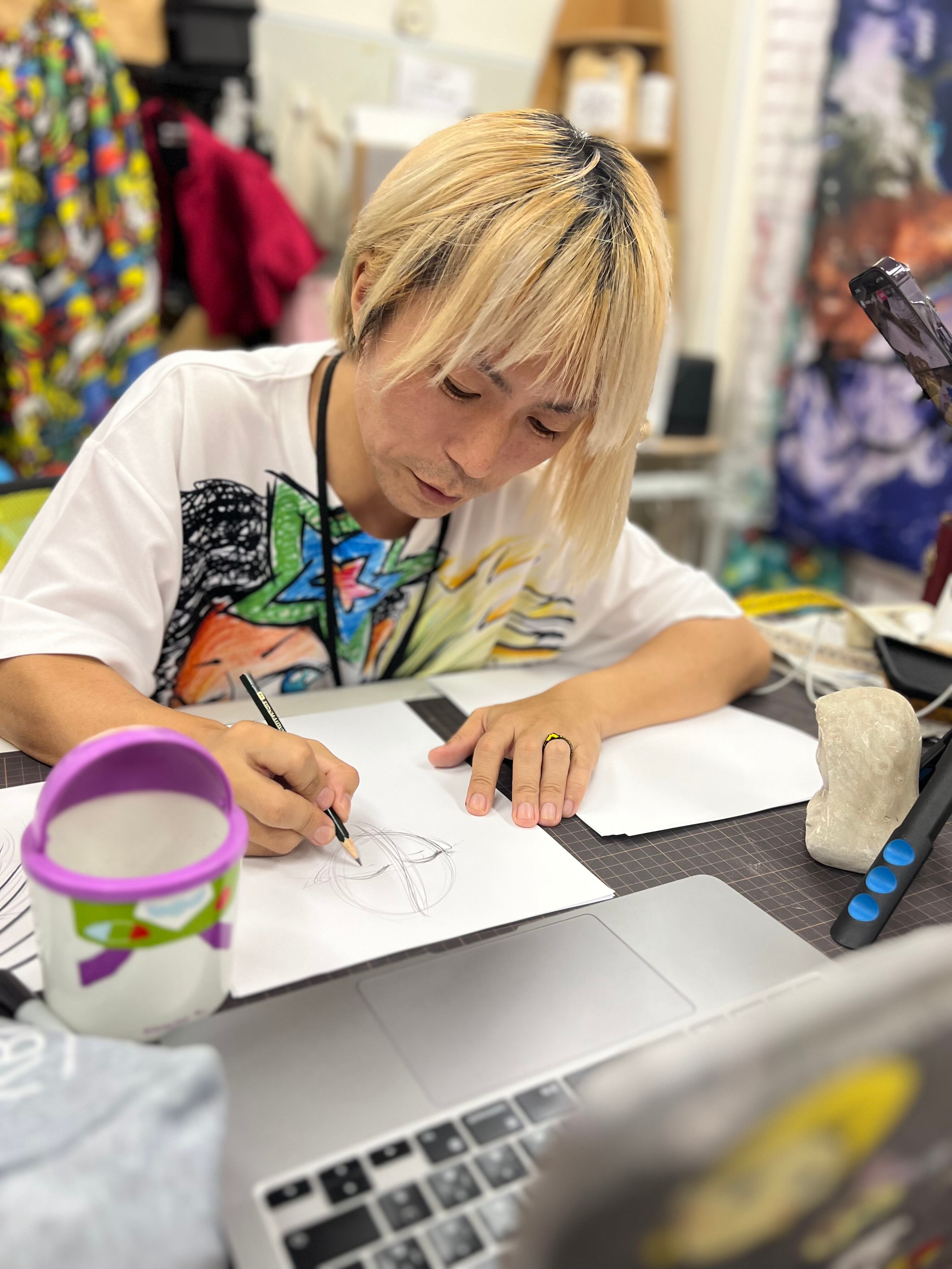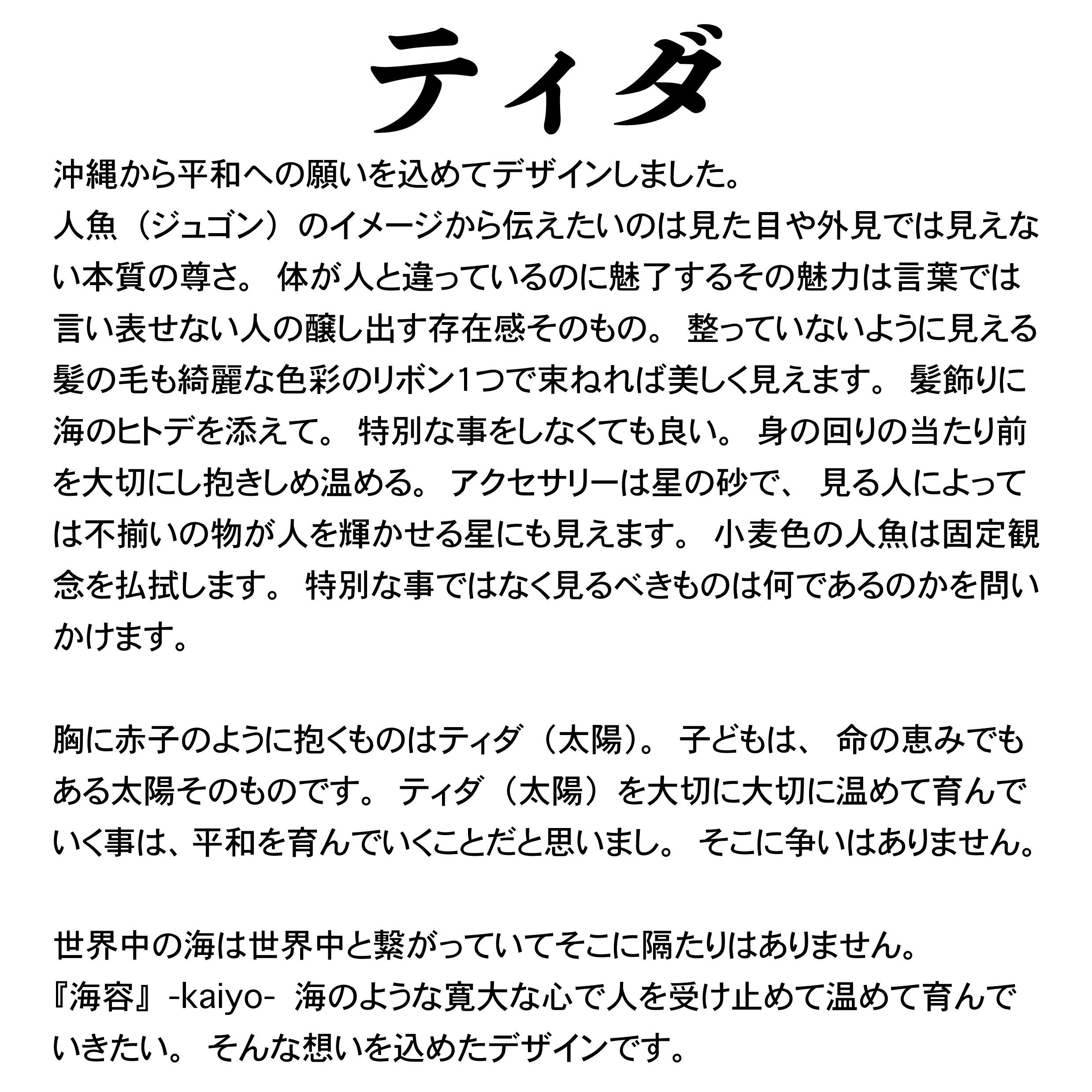 沖縄から平和への願いを込めてデザインしました。人魚(ジュゴン)のイメージから伝えたいのは見た目や外見では見えない本質の尊さ。体が人と違っているのに魅了するその魅力は言葉では言い表せない人の醸し出す存在感そのもの。整っていないように見える髪の毛も綺麗な色彩のリボン1つで束ねれば美しく見えます。髪飾りに海のヒトデを添えて。特別な事をしなくても良い。身の回りの当たり前を大切にし抱きしめ温める。アクセサリーは星の砂で、見る人によっては不揃いの物が人を輝かせる星にも見えます。小麦色の人魚は固定観念を払拭します。特別な事ではなく見るべきものは何であるのかを問いかけます。胸に赤子のように抱くものはティダ(太陽)。子どもは、命の恵みでもある太陽そのものです。ティダ(太陽)を大切に大切に温めて育んでいく事は、平和を育んでいくことだと思いまし。そこに争いはありません。世界中の海は世界中と繋がっていてそこに隔たりはありません。